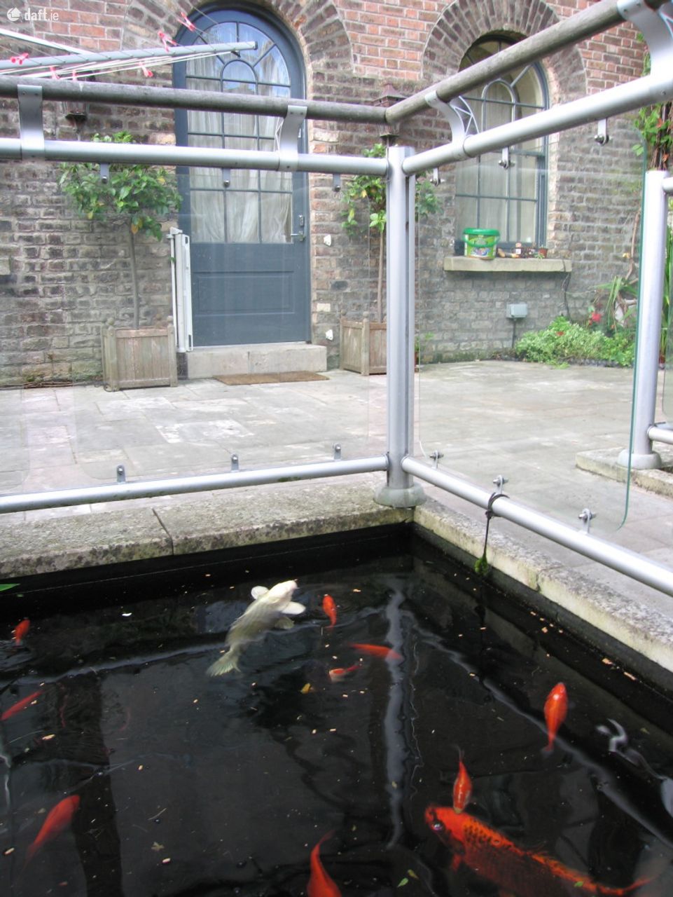Secluded garden with large koi pond and travertine patio, garden shed and kennel.