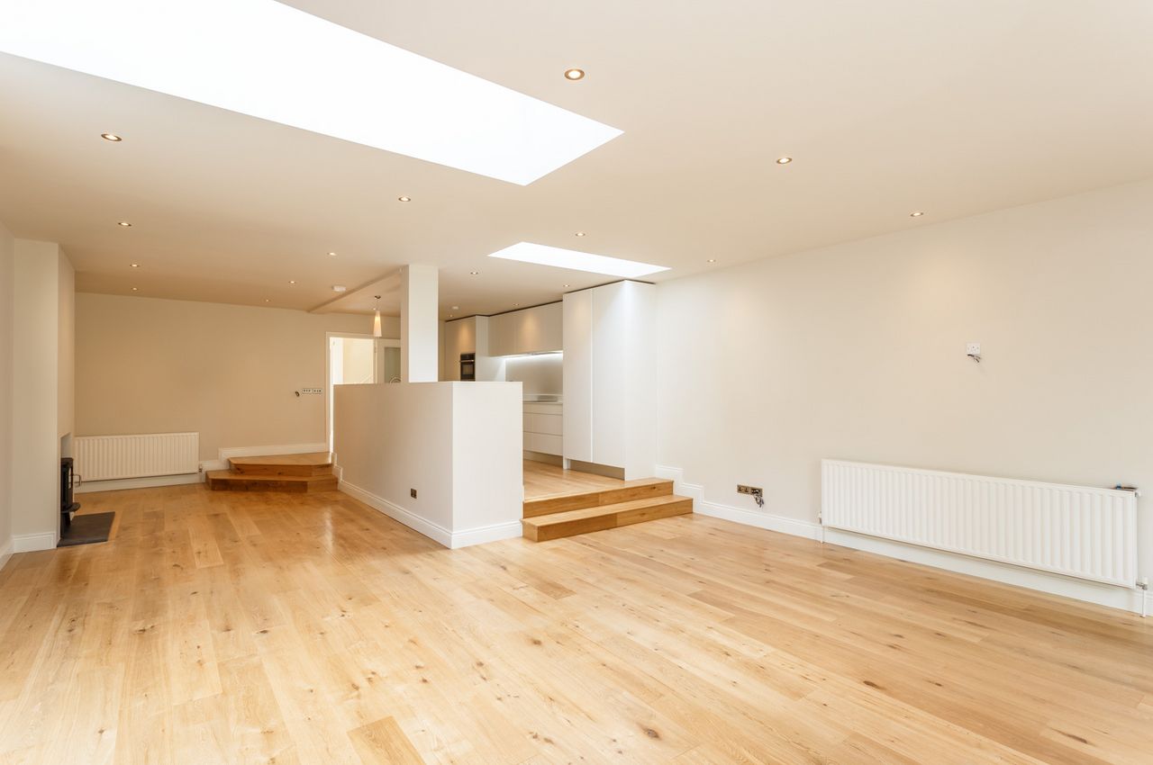 The property comprises: bright entrance hall, large living come dining room running down to large French doors leading to a beautiful patio and Landscaped rear garden. Large sleek Bespoke kitchen with quality appliances throughout.