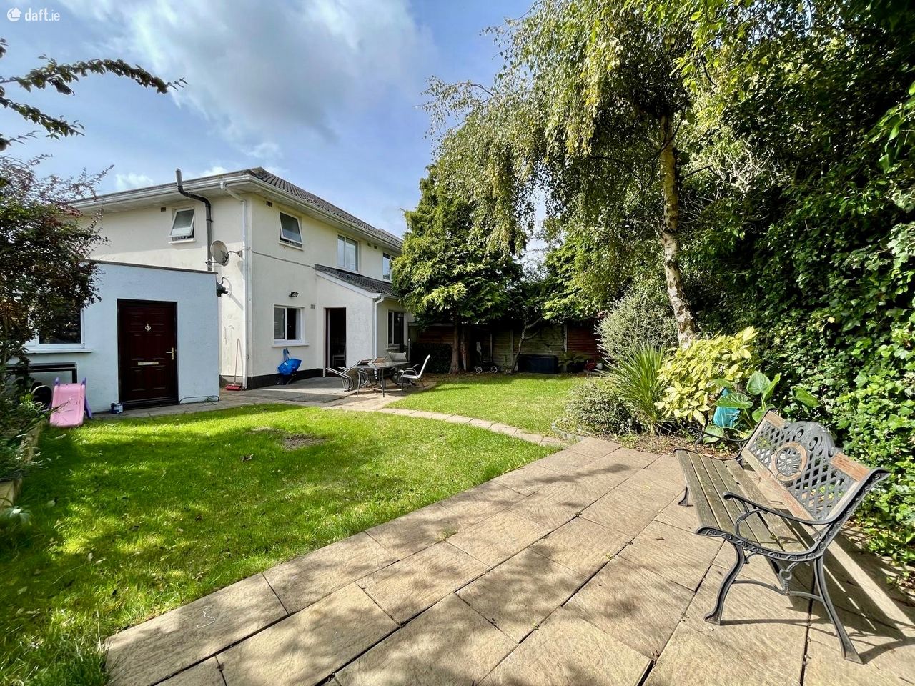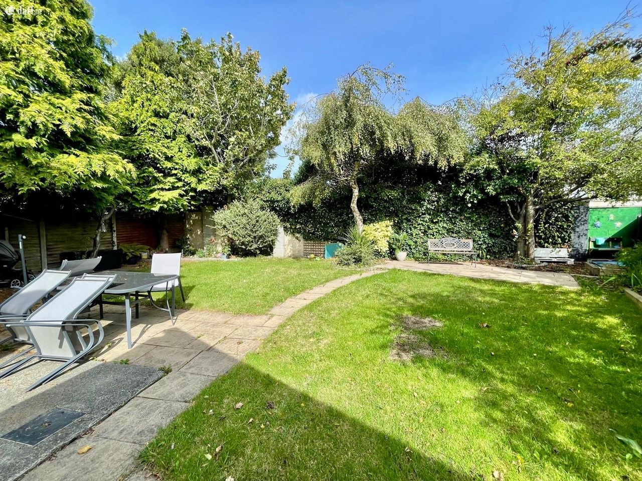 The back garden has a nice mix of grass and patio, perfect for outdoor dining or relaxing.