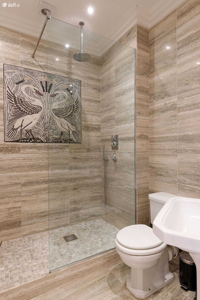 Upgraded bathroom with solid travertine marble throughout with feature hand made solid marble mosaic and wet room style integrated shower
