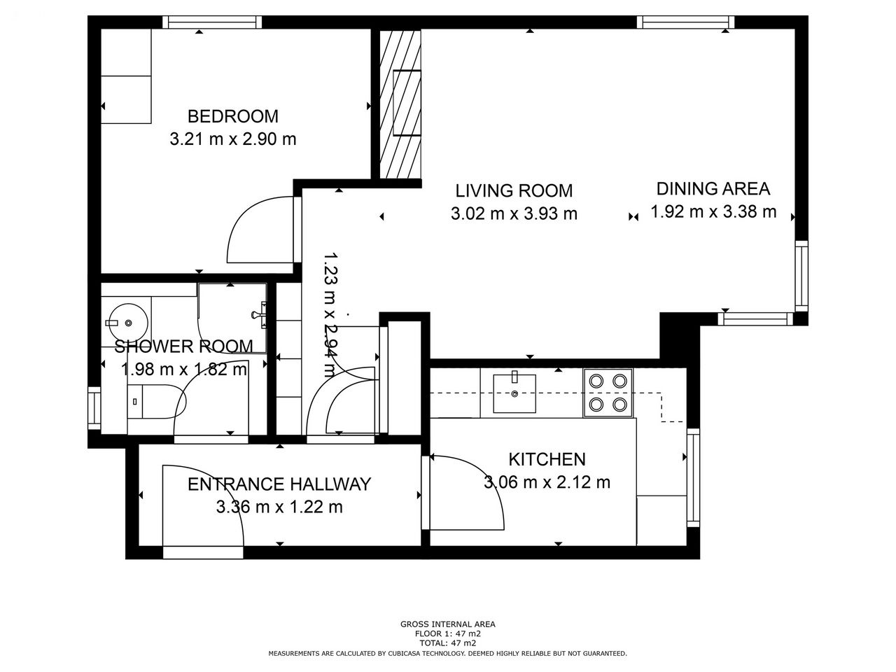 At approx. 47sqm the apartment comprises of a large living/dining room with electric fire and a large kitchen. Bathroom with shower and double bedroom.